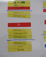 ホワイトボードに1日の仕事と清掃順番を示したカードが貼られている。傍線が休憩、お昼休みを挟んで午前と午後の仕事場所を示している。この日はトイレ掃除を中心に行っている。 |