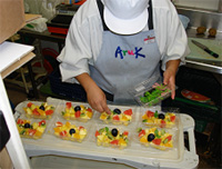 Dさんは山口県内の知的障害特別支援養護学校の高等部を卒業して当社に入った。最初の勤務店である「アルク南浜店」(宇部市内)から、その後「アルク大内店」に転籍した。近隣にある自宅から自転車で通勤しながら約6年近くが経過した。現在、パート従業員であり、青果の部門で勤務している。Dさんの仕事の一つに、数種類の果物を包丁で小さなブロックに分割し、それらを盛り合わせて「カットフルーツ」を作るという内容がある。包丁を持つ手も安定しており、色彩豊かで新鮮なカットフルーツが次々に出来上がっていく。