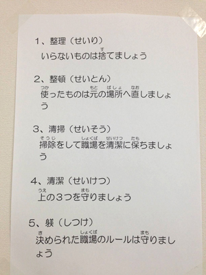 また、写真にもあるように、5S(整理、整頓、清掃、清潔、躾)やグループ単位での課題や目標を全員が確認できるように、常に見える場所に掲示して、従業員個々が確認できるようにしている。